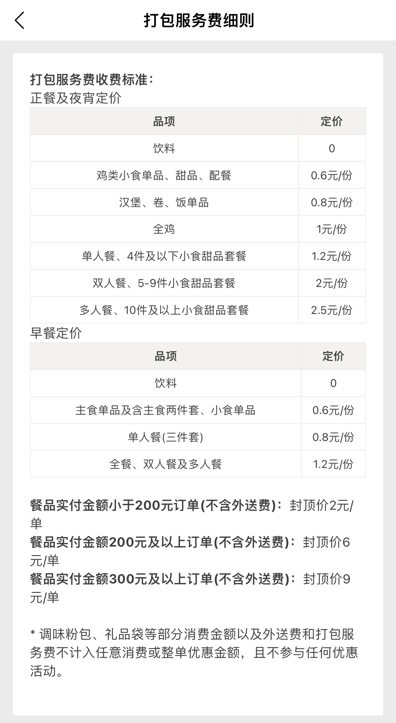 肯德基公布細(xì)則顯示,正餐及夜宵方面,雞類小食單品、甜品、配餐打包服務(wù)費為0.6元/份,漢堡、卷、飯單品打包服務(wù)費為0.8元/份,全雞打包服務(wù)費為1元/份,單人餐、4件及以下小食甜品套餐打包服務(wù)費為1.2元/份,雙人餐、5-9件小食甜品套餐打包服務(wù)費為2元/份,多人餐、10件及以上小食甜品套餐打包服務(wù)費為2.5元/份,飲料則不收打包服務(wù)費。