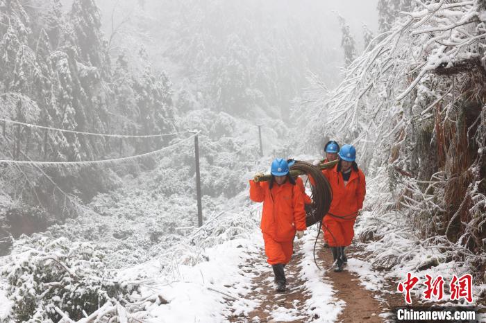 2月8日,國網(wǎng)浙江電力援湘搶險隊員前往平江縣開展搶修作業(yè),扛運(yùn)搶修物資?!±盥勎?攝