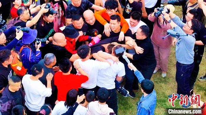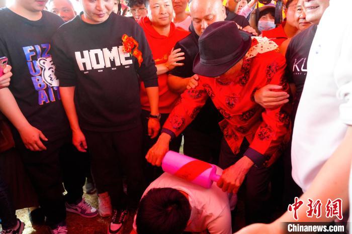 “酒醉公”手持搟面杖,逐一“打”前一年剛結婚的“新郎官”。永定區(qū)融媒體中心供圖