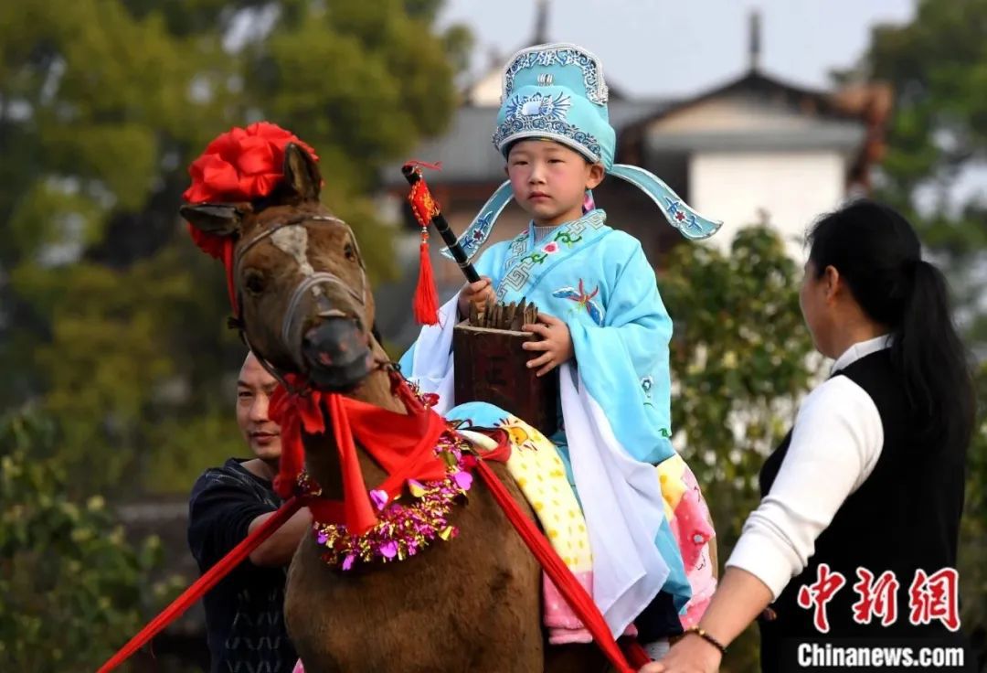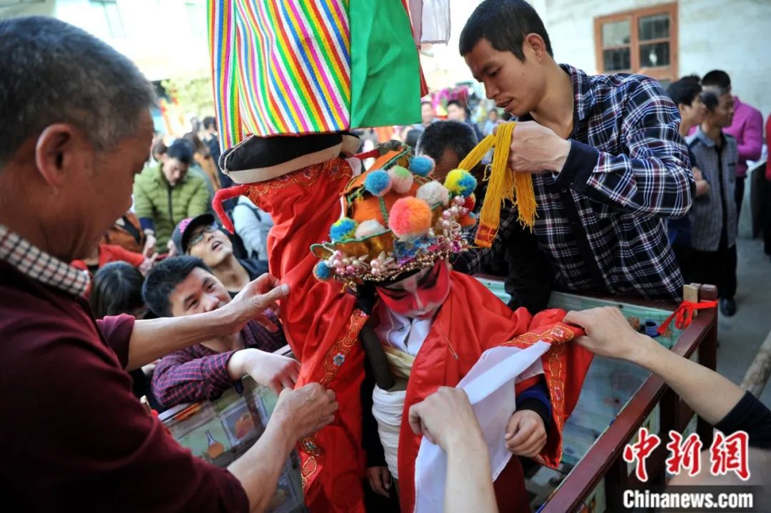 連城縣羅坊鄉(xiāng)舉行國家級非物質(zhì)文化遺產(chǎn),享有“中國客家狂歡節(jié)”美譽(yù)的“走古事”民俗活動。圖為立于轎臺之上參加“走古事”的兒童。中新社記者 張斌 攝