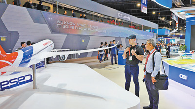 在中國(guó)商飛展區(qū),觀眾在認(rèn)真觀摩C929飛機(jī)模型。