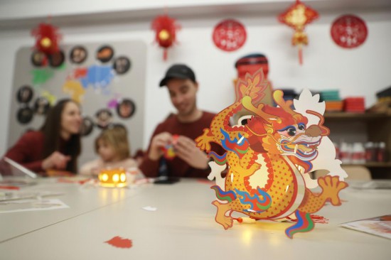 2月24日,人們在比利時班什舉行的“金龍迎新——2024比利時生肖設(shè)計展”期間體驗制作龍形燈籠。(新華社記者趙丁喆攝)