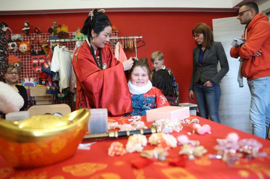 2月24日,小朋友在比利時班什舉行的“金龍迎新——2024比利時生肖設(shè)計展”期間體驗漢服妝造。(新華社記者趙丁喆攝)