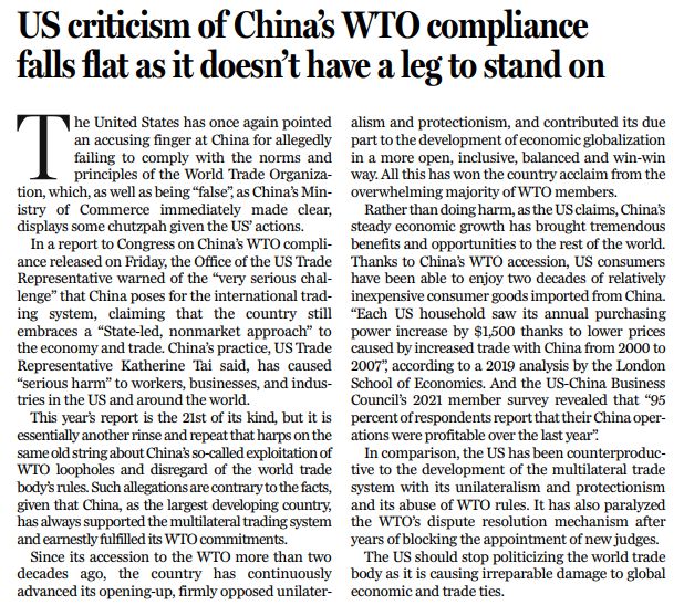原標(biāo)題:US criticism of China's WTO compliance falls flat as it doesn't have a leg to stand on