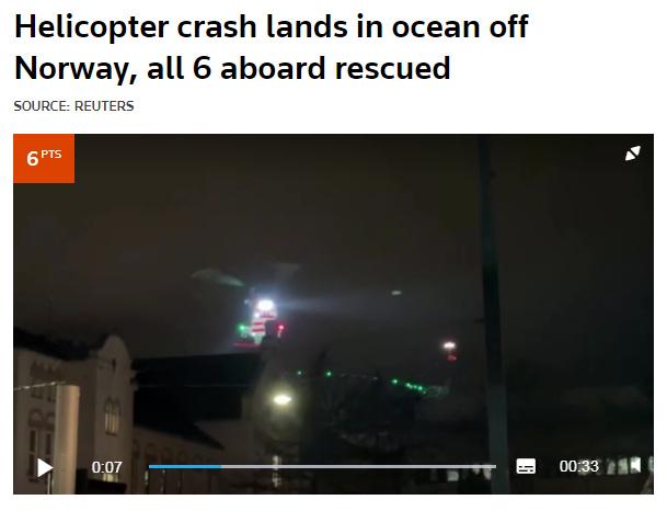 中新網2月29日電 據路透社報道,當地時間28日,挪威聯合救援協(xié)調中心稱,一架載有6人的直升機在挪威西部海岸附近海域墜毀,機上所有人員隨后被從海中救起。