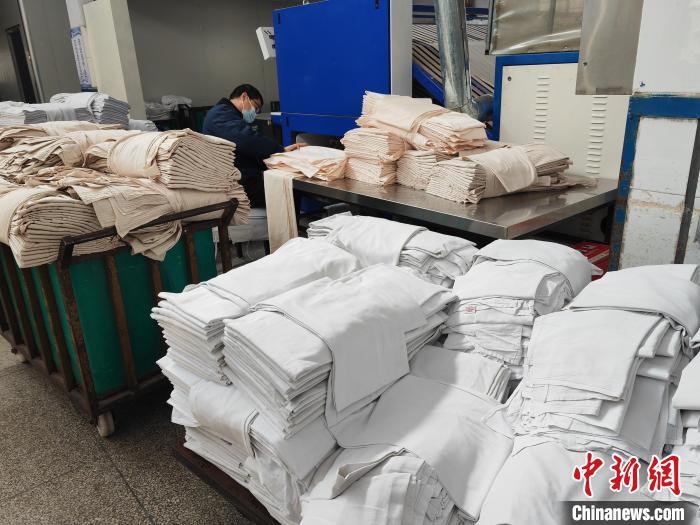 臥具從工業(yè)洗衣機里撈出后,就進入烘干、消毒、熨燙工序,從進入烘干機到再從熨燙機出來,只需10秒,原本滴水的臥具就變得干燥平展。這對負責折疊、打包的洗滌工手速有著極高的要求。