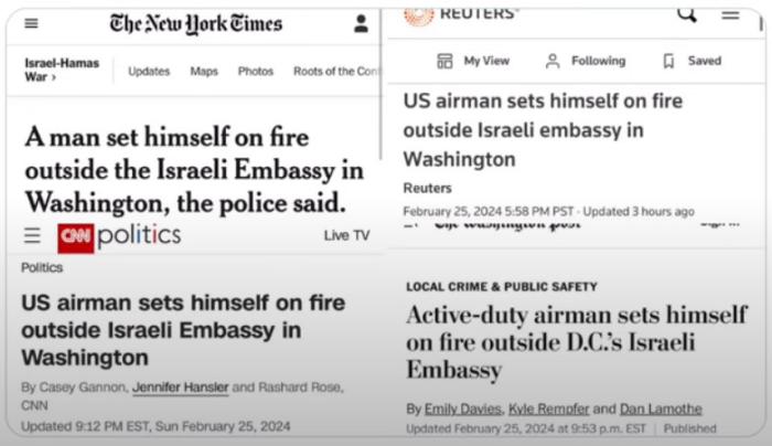 其中紐時的標(biāo)題最為極品——《警方表示:一男子在華盛頓的以色列使館外自焚》