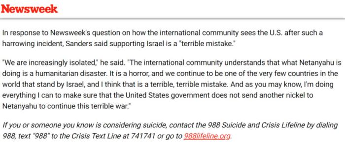 另一家媒體《新聞周刊》,現(xiàn)在則會在每一篇有關(guān)布什內(nèi)爾的文章文末附上預(yù)防自殺熱線的信息。比如下面這篇文章只是關(guān)于美國左翼議員伯尼·桑德斯對布什內(nèi)爾事件的評論,內(nèi)容跟布什內(nèi)爾本人其實無甚關(guān)系,也要附上這么一段……
