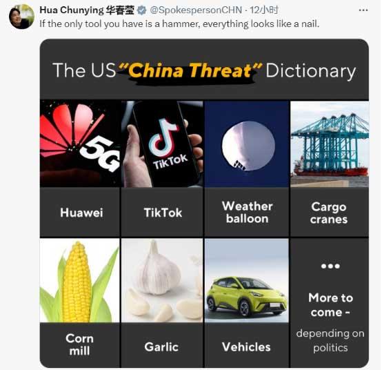 華春瑩最后回?fù)簦叭绻阄ㄒ坏墓ぞ呤清N子,那么所有東西看起來都像釘子。”這條帖文隨附圖片上,列出美國(guó)以往炒作“中國(guó)威脅”的詞典:包括華為,TikTok,氣象無人飛艇,起重機(jī),玉米加工廠,大蒜,汽車……還有更多,取決于政治因素。↓