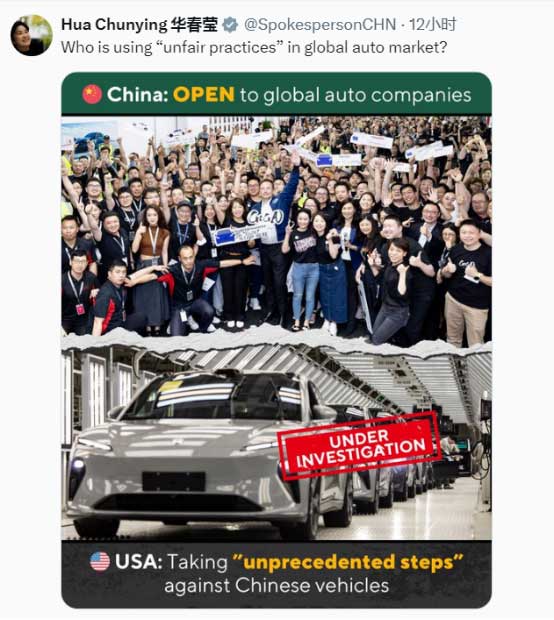 她隨后發(fā)表圖文,對(duì)比中美在汽車行業(yè)的行為問道,“是誰在全球汽車市場(chǎng)采取‘不公平做法’?”圖片顯示,中國(guó)的做法是“向全球車企”開放,而美國(guó)正針對(duì)中國(guó)汽車采取“前所未有的措施”?!?/p>