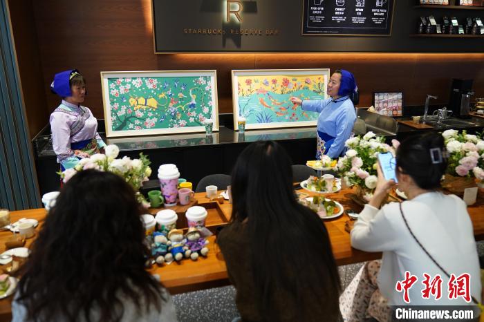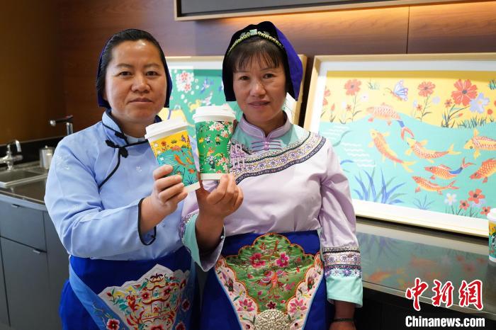 圖為農(nóng)民畫家展示她們被印在星巴克咖啡紙杯上的畫作。中新網(wǎng)記者 劉冉陽(yáng) 攝