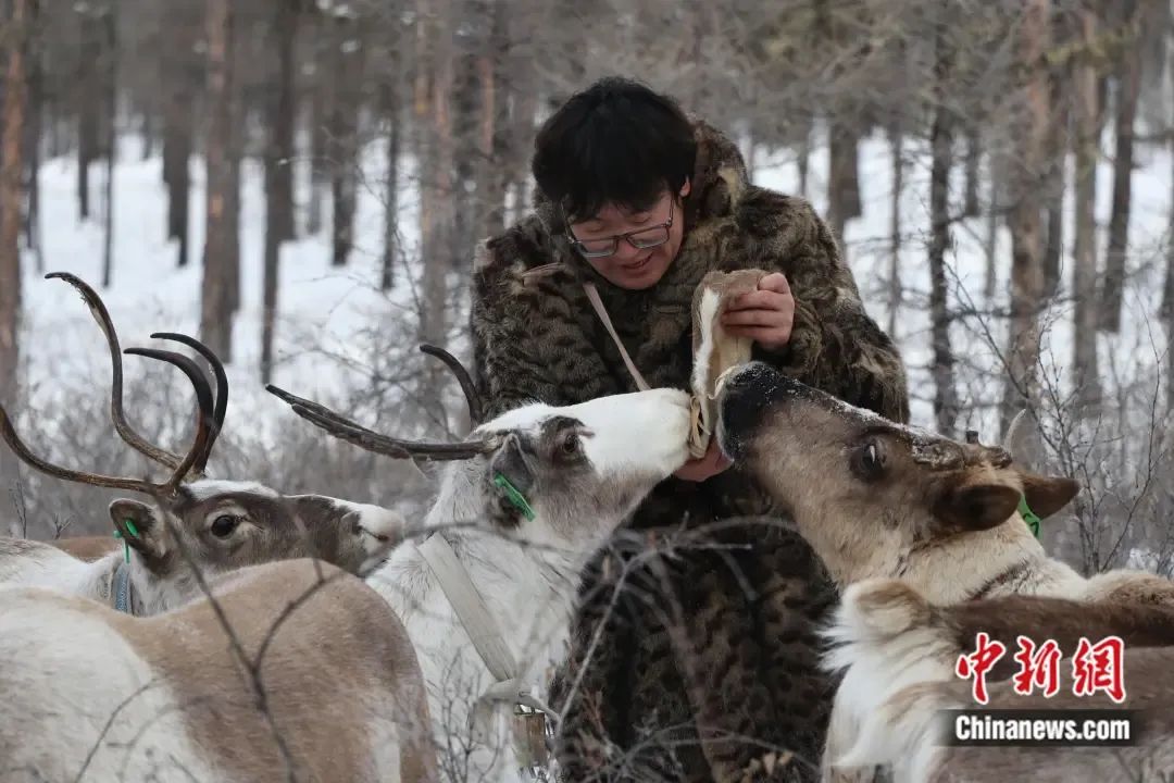 在中國(guó)最后一支使鹿部落里,馴鹿貪婪地吃著使鹿鄂溫克人覺樂手里的豆餅。 王鄭胤 攝