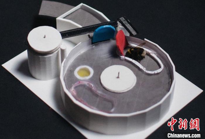 這個兩步謎題盒中黃色圓圈位置有一滴糖水,透過透明塑料蓋可以看到。要獲得獎勵蜜蜂必須推動紅色標(biāo)簽旋轉(zhuǎn)透明蓋子,直到標(biāo)簽后的月牙形開口位于黃色液滴上方。不過只有先推開藍(lán)色標(biāo)簽,才能移動紅色標(biāo)簽。(圖片來自倫敦瑪麗女王大學(xué))。施普林格·自然/供圖