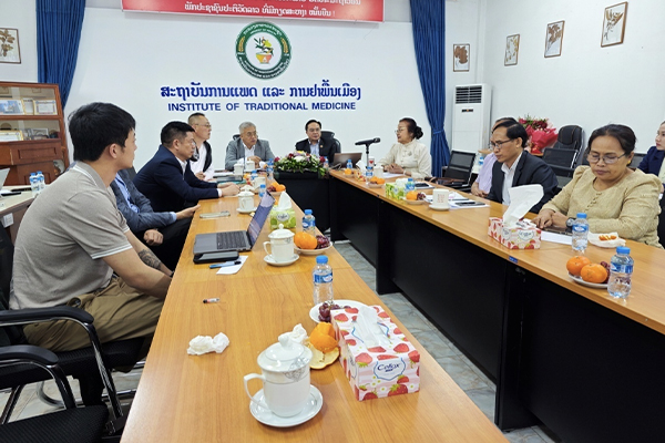 老撾衛(wèi)生傳統(tǒng)醫(yī)藥研究院黨委書記,院長(zhǎng)Dr. Bounleuane Douangdeuane、老撾衛(wèi)生熱帶醫(yī)學(xué)與公共衛(wèi)生研究院創(chuàng)始院長(zhǎng)Prof.Dr.Boungnong Boupha、張秋利博士商談合作具體事宜