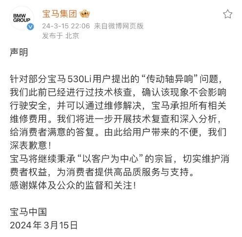 當晚,寶馬集團也發(fā)布聲明稱,“針對部分寶馬530Li用戶提出的‘傳動軸異響’問題,我們此前已經(jīng)進行過技術(shù)核查,確認該現(xiàn)象不會影響行駛安全,并可以通過維修解決,寶馬承擔所有相關(guān)維修費用。我們將進一步開展技術(shù)復查和深入分析,給消費者滿意的答復。由此給用戶帶來的不便,我們深表歉意!”
