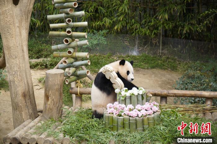 2023年7月20日,旅韓大熊貓“福寶”迎來三周歲生日。三星愛寶樂園為“福寶”舉行生日會(huì)慶生。圖為“福寶”和它的竹子“蛋糕”。 中新網(wǎng)記者 劉旭 攝