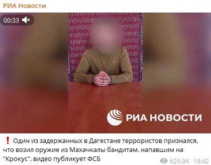 “我給那些襲擊了莫斯科‘克羅庫(kù)斯城’音樂廳的人帶去了武器。武器是我從馬哈奇卡拉帶到梅季希的?!逼渲幸蝗吮硎?。