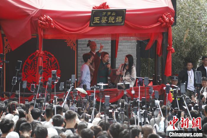 在“王婆說(shuō)媒”現(xiàn)場(chǎng),中新網(wǎng)記者看到人山人海的游客以年輕人居多,“王婆”扮演者趙梅因口才、表演力、控場(chǎng)等功底詼諧幽默,深受到年輕人追捧,她不時(shí)插科打諢、即興歌舞,引得現(xiàn)場(chǎng)陣陣歡呼。