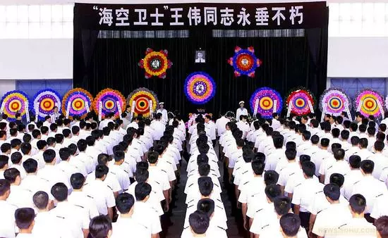 2001年4月26日,海南三亞,海軍舉行海上祭奠“海空衛(wèi)士”王偉烈士活動(dòng)。