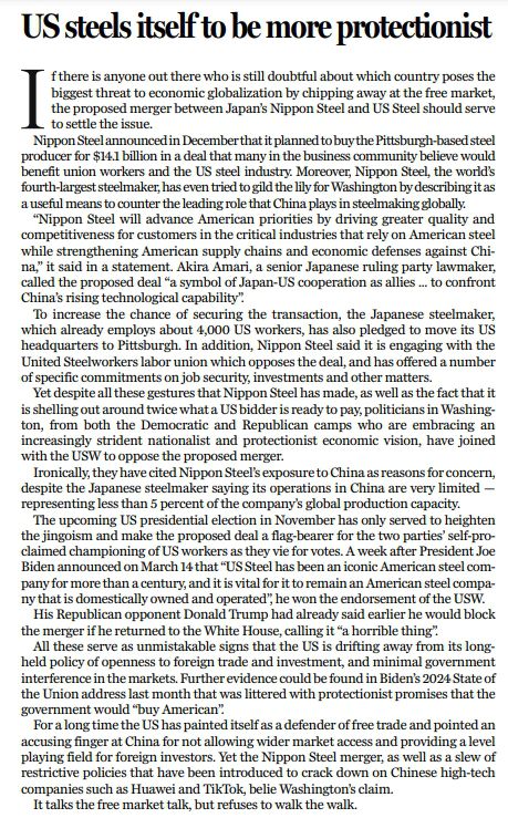 放眼當(dāng)今世界,一直在削弱自由市場(chǎng)、對(duì)經(jīng)濟(jì)全球化構(gòu)成最大威脅的究竟是哪個(gè)國(guó)家?如果仍然有人對(duì)此心存疑惑,那看看最近新日本制鐵公司(以下簡(jiǎn)稱(chēng)新日鐵)計(jì)劃收購(gòu)美國(guó)鋼鐵公司的事件,或許就會(huì)有答案。