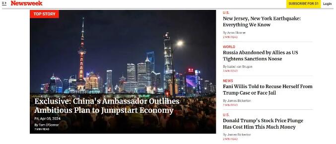 據(jù)中國駐美國大使館網(wǎng)站消息,4月5日,中國駐美國大使謝鋒就“新質(zhì)生產(chǎn)力”和中國經(jīng)濟形勢接受美國《新聞周刊》(Newsweek)高級外交政策記者湯姆·奧康納專訪,訪談內(nèi)容當日在該周刊網(wǎng)站刊登。