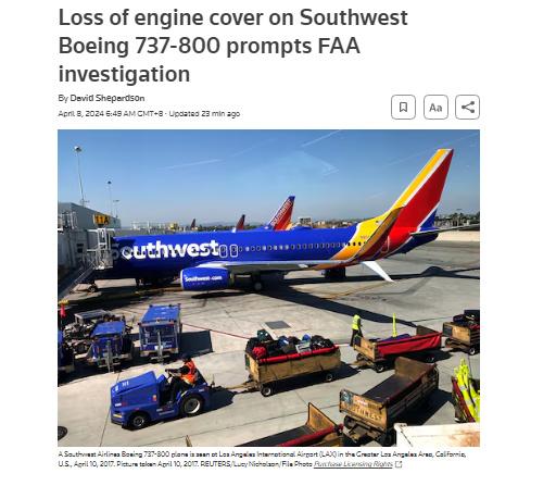 中新網(wǎng)4月8日電 據(jù)路透社報道,當(dāng)?shù)貢r間4月7日上午,美國西南航空公司一架從科羅拉多州丹佛飛往得克薩斯州休斯敦的波音737-800型客機在起飛過程中,發(fā)動機罩發(fā)生脫落。