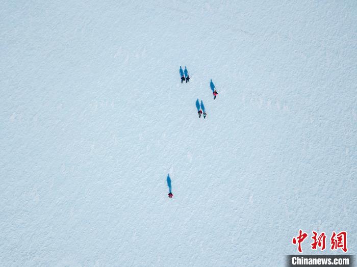 藍冰上的科學(xué)家、野外向?qū)Ш陀浾?。照片攝于智利南極研究所(INACH)2022年對南極洲埃爾斯沃斯山脈聯(lián)合冰川的實地考察(圖片來自智利圣地亞哥大學(xué)Jose Jorquera)。施普林格·自然/供圖