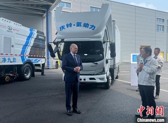 博世氫動力系統(tǒng)(重慶)有限公司是朔爾茨訪渝首站參觀地。該公司由博世與慶鈴汽車合資建立,致力于將博世氫燃料電池解決方案引入中國市場。在參訪點入口,四輛冷鏈物流、環(huán)衛(wèi)及牽引車等依次停放。這些車全為中國國產(chǎn)汽車,使用博世氫動力系統(tǒng)(重慶)有限公司出產(chǎn)的氫動力模塊。朔爾茨在企業(yè)相關(guān)負(fù)責(zé)人的介紹下,了解博世與中企合作的最新成果。在工作人員指引下,朔爾茨為完成預(yù)裝的氫動力模塊拴緊最后一顆螺絲,向身邊工作人員豎起了大拇指。