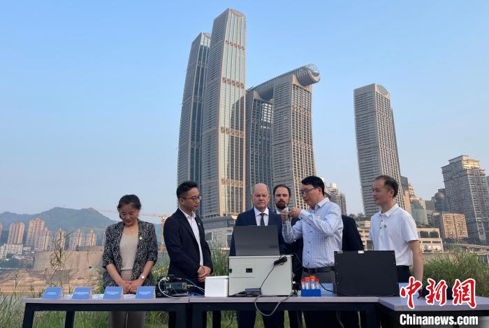 2019年,重慶大學(xué)智能生化傳感與精密儀器團(tuán)隊和德國庫特-施瓦伯測量與傳感器科技研究所,共同開展生態(tài)環(huán)境保護(hù)領(lǐng)域的水環(huán)境污染物高效檢測技術(shù)與裝備的研究開發(fā)。在長江和嘉陵江交匯處的江岸邊,該項目的重慶大學(xué)研究團(tuán)隊向朔爾茨介紹檢測儀器如何進(jìn)行水質(zhì)檢測與分析。朔爾茨將檢測樣品注入檢測儀后,查看了檢測結(jié)果。