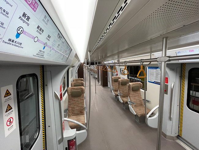 走進車廂,記者注意到,車內(nèi)沒有用來隔絕駕駛室與客室的間壁門,而是采用開放式駕駛室,乘客可在保證安全的情況下更直觀地感受駕駛員的視角。此外,考慮到接駁大興機場線大件行李旅客的需求,“虎鯨號”列車設(shè)計2節(jié)“特別”車廂,車廂內(nèi)設(shè)置左右兩邊單列單座的高鐵同款座椅,乘客可將大件行李放在座位側(cè)邊,避免車廂內(nèi)擁擠。