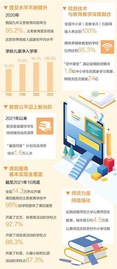 黨的十八大以來,在以習近平同志為核心的黨中央堅強領(lǐng)導(dǎo)下,我國義務(wù)教育取得了舉世矚目的成就:2020年,我國九年義務(wù)教育鞏固率為95.2%,義務(wù)教育普及程度達到世界高收入國家的平均水平;實施義務(wù)教育薄弱環(huán)節(jié)改善和能力提升項目,發(fā)展“互聯(lián)網(wǎng)+”教育助力城鄉(xiāng)教育均衡,全國義務(wù)教育基本均衡已經(jīng)全面實現(xiàn)……讓適齡兒童少年有學上、上好學,讓每個孩子都能享有公平而有質(zhì)量的教育,正在成為現(xiàn)實。