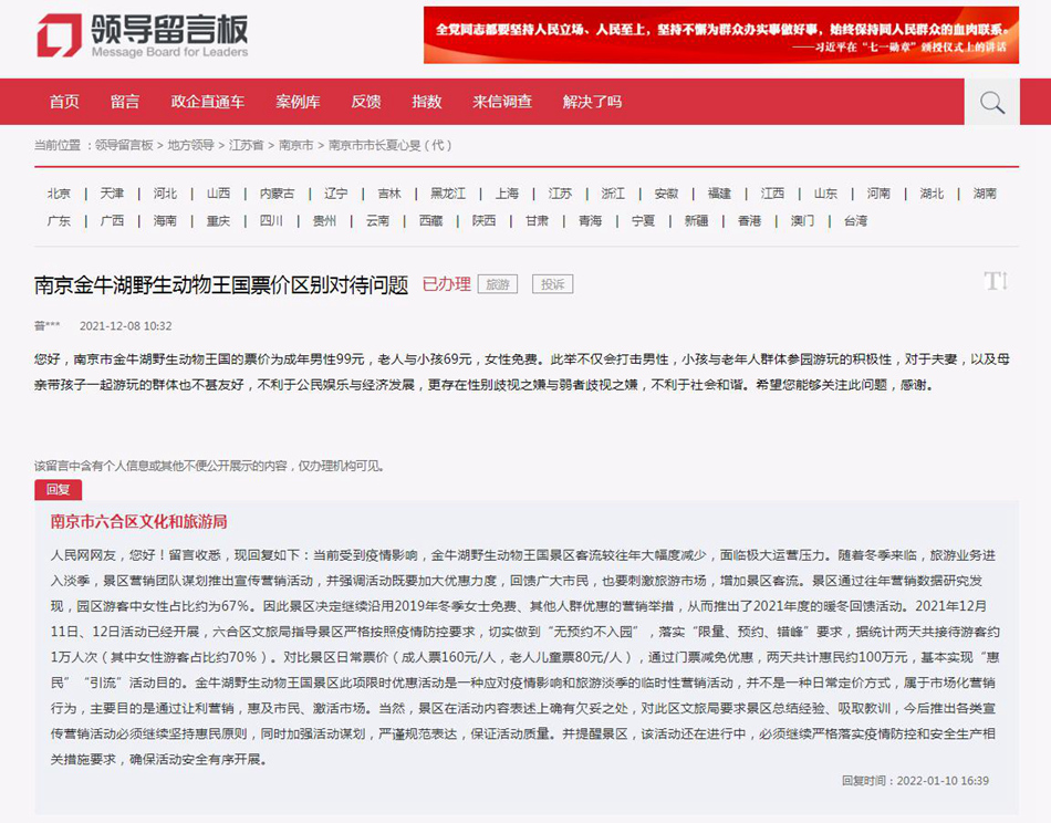 2021年12月8日,網友在人民網“領導留言板”向南京市市長留言稱,南京市金牛湖野生動物王國的票價為成年男性99元,老人與小孩69元,女性免費。此舉不僅打擊男性、小孩與老年人參園游玩的積極性,而且對于夫妻以及母親帶孩子一起游玩的群體也不甚友好,不利于公民娛樂與經濟發(fā)展,另外更存在性別歧視與弱者歧視之嫌,不利于社會和諧。