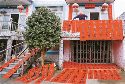 “和順一門(mén)有百福 平安二字值千金”……1月13日上午,在寧波寧海縣黃壇鎮(zhèn)永聯(lián)村村民王光彬家中,房間里飄散著濃濃的墨香,幾百副春聯(lián)鋪天蓋地,從墻上蔓延到地上,掛得密密麻麻。