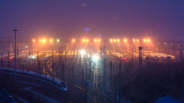 凌晨,一列動車組列車駛出上海虹橋動車運用所。上海鐵路部門供圖