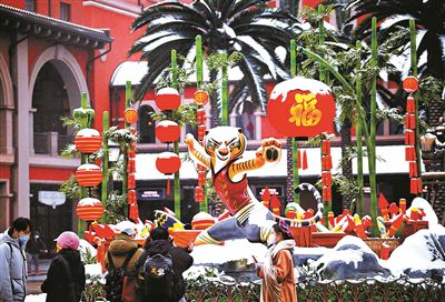 遍布園區(qū)的新春主題裝飾、全新推出的新春主題娛樂演出、充滿“年味”的限定美食……昨日,在紛紛揚(yáng)揚(yáng)的雪花中,北京環(huán)球度假區(qū)開啟了首個“環(huán)球中國年”季節(jié)性主題活動。即日起至2月20日,帶有春節(jié)特色的全新娛樂體驗將伴隨游客一起辭舊迎新,共同迎接虎年春節(jié)的到來。