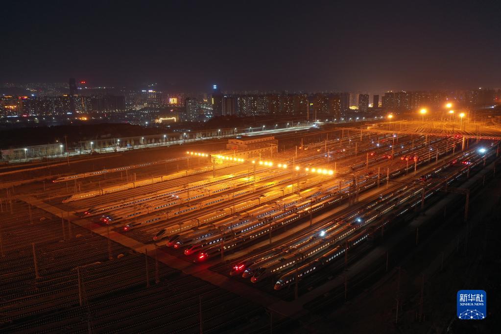 1月16日晚,動車組列車停靠在中國鐵路蘭州局集團有限公司蘭州車輛段蘭州西動車運用所整備場上,為1月17日開始的2022年春運做好準備(無人機照片)。新華社記者 杜哲宇 攝
