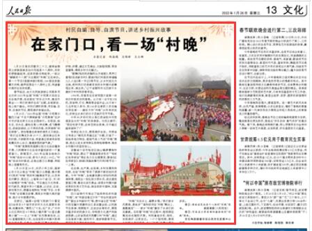 1月25日至26日,農(nóng)歷小年之際,國(guó)家公共文化云推出“村晚”接力云展播,集中展示《我的“村晚”我的年》融媒體節(jié)目,以及來(lái)自?xún)?nèi)蒙古、黑龍江、上海等20個(gè)?。▍^(qū)、市)的30場(chǎng)精彩“村晚”活動(dòng)。節(jié)目通過(guò)文化傳承、時(shí)代新風(fēng)、展望未來(lái)3個(gè)篇章,以訪談、互動(dòng)、游戲等方式,展播各地特色“村晚”節(jié)目、分享“村晚”臺(tái)前幕后故事、展現(xiàn)鄉(xiāng)村振興美好畫(huà)卷、推介鄉(xiāng)村美景好物。