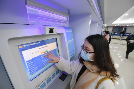 2021年1月15日,在國家稅務(wù)總局福州市臺江區(qū)稅務(wù)局辦稅服務(wù)廳,一名企業(yè)員工通過自助終端查詢納稅信用等信息。新華社記者 宋為偉 攝