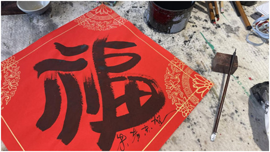 朱者赤是去年7月入駐藝術(shù)村的自由職業(yè)藝術(shù)家,今年,他決定留在林家村過年,他希望以送“?!钡姆绞絹肀磉_(dá)自己真摯的祝福,與村民們一起歡度春節(jié)。581幅各不相同的藝術(shù)“福”字,正是他送給村中581戶家庭的新年禮物?!叭腭v半年來,政府部門的關(guān)心幫助和支持與村民們熱情地問候讓我非常感動(dòng),我懷著感恩的心情,寫下這581個(gè)創(chuàng)意福字。”朱者赤說。