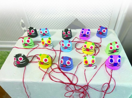 記者看到,吳為民的老伴王培珍拎起兩只系著紅繩的“皮老虎”,熟練地倒置在顏料桶中,等到其身體全部浸沒,立刻拿出,迅速掛在旁邊細長的竹竿上,三四天之后,方能上畫。只見王培珍在模型上用自制毛筆畫了起來,不一會兒,“皮老虎”胡須就出來了,最后用紅、白顏料分別點出“皮老虎”的眼白、眼珠和耳朵,一只活靈活現(xiàn)的老虎就畫成了。