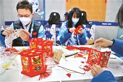 昨天是中國(guó)的傳統(tǒng)節(jié)日元宵佳節(jié),國(guó)家體育館開展了豐富多彩的慶祝活動(dòng),當(dāng)天場(chǎng)館餐廳提供了湯圓,場(chǎng)館禮賓部工作人員向外賓介紹中國(guó)吃湯圓的由來和寓意,并邀請(qǐng)大家品嘗。在志愿者之家內(nèi),彩燈高懸,充滿歡聲笑語,志愿者們做燈籠、猜燈謎,共同度過一個(gè)歡樂祥和的元宵節(jié)。圖為冬奧志愿者在制作花燈。文并攝/本報(bào)記者 黑建軍