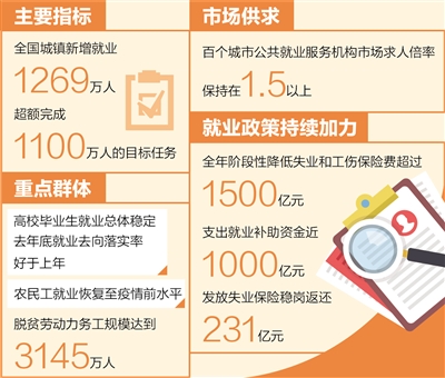 看主要指標(biāo),全國城鎮(zhèn)新增就業(yè)1269萬人,超額完成1100萬人的目標(biāo)任務(wù);全年全國城鎮(zhèn)調(diào)查失業(yè)率平均值為5.1%,比上年平均值下降0.5個百分點,就業(yè)目標(biāo)任務(wù)圓滿完成。