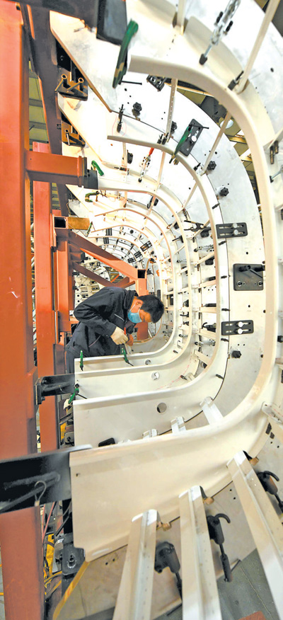 河北石家莊一家大型裝備制造企業(yè),技術(shù)人員在裝配飛機(jī)發(fā)動(dòng)機(jī)短艙。