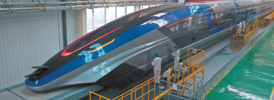 在位于山東青島的中車四方股份有限公司,工作人員對(duì)研發(fā)中的高速磁浮列車進(jìn)行調(diào)試。
