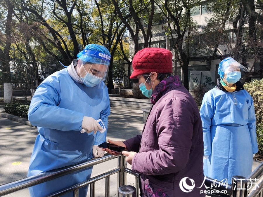 因疫情滯留蘇州的寧波游客黃杰(左)就地成為一名志愿者。人民網(wǎng)記者 王繼亮攝