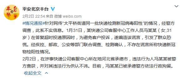 據(jù)北京豐臺公安分局官方微博消息,針對網(wǎng)上流傳“太平橋街道同一批快遞檢測新冠病毒陽性”的情況,經(jīng)警方調(diào)查,此系不實信息。1月31日,某快遞公司客服中心工作人員馮某某(女,31歲)在答復超時投遞原因時,為避免客戶投訴,遂編造該謊言,引發(fā)了群眾恐慌。經(jīng)疾控、郵政、公安等部門聯(lián)合調(diào)查、檢測確認,不存在謊言所稱快遞新冠物檢陽性情況。