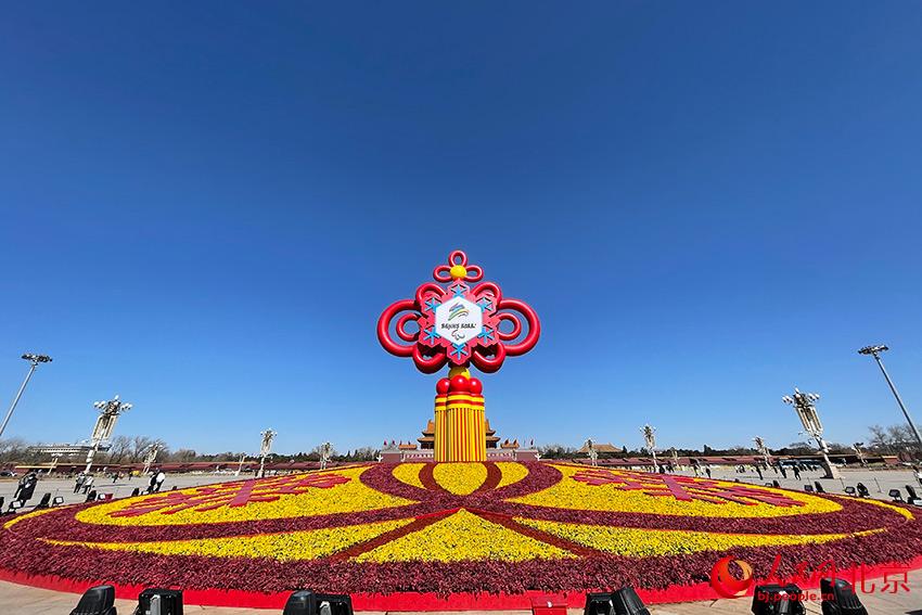 天安門(mén)廣場(chǎng)“精彩冬奧”主題花壇完成冬殘奧會(huì)會(huì)徽更換。人民網(wǎng) 尹星云攝