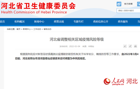 人民網(wǎng)石家莊3月4日電 據(jù)河北省衛(wèi)健委發(fā)布的最新消息,根據(jù)國務(wù)院應(yīng)對新型冠狀病毒肺炎疫情聯(lián)防聯(lián)控機(jī)制關(guān)于科學(xué)劃分、精準(zhǔn)防控等工作要求,自2022年3月4日起,河北省將邢臺市清河縣葛仙莊鎮(zhèn)袁宋莊村調(diào)整為中風(fēng)險地區(qū)。