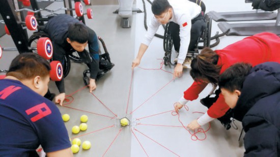 徐守森(右一)帶領(lǐng)輪椅冰壺運(yùn)動(dòng)員通過互動(dòng)游戲緩解比賽壓力。