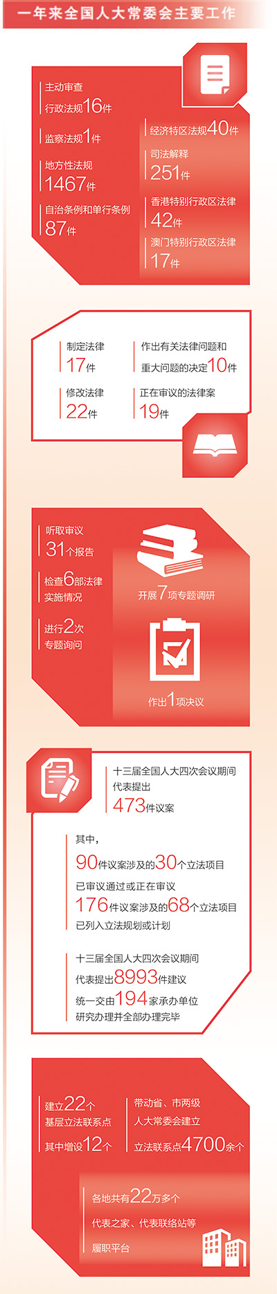 十三屆全國(guó)人大四次會(huì)議期間代表提出的473件議案,已由相關(guān)專門委員會(huì)全部審議完畢;十三屆全國(guó)人大四次會(huì)議期間代表提出的8993件建議,統(tǒng)一交由194家承辦單位研究辦理并全部辦理完畢……聽全國(guó)人大常委會(huì)工作報(bào)告,代表們表示,獲得感、成就感滿滿。